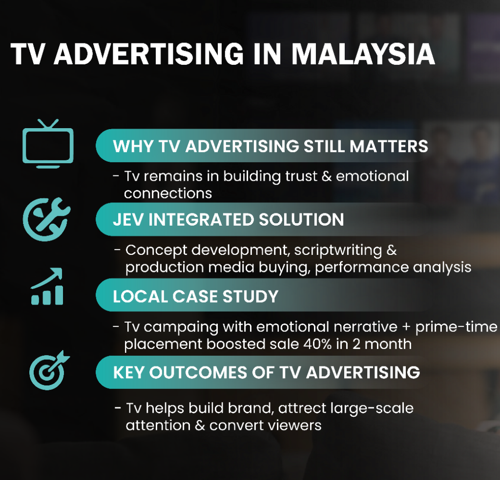 Television remains one of the most powerful platforms for businesses looking to engage Malaysian audiences on a large scale. At JEV Integrated, we specialize in crafting impactful TV advertising campaigns that capture attention, build brand recognition, and deliver tangible results.